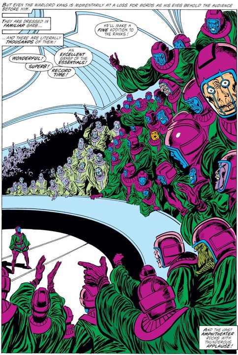 Avengers (1963) #267 introdujo el Consejo de Kangs, que es esencialmente una reunión de Kangs de miles de líneas temporales diferentes. Con Avengers (1963) #292 conocimos el Council of Cross-Time Kangs (Consejo de Kangs de todos los tiempos).