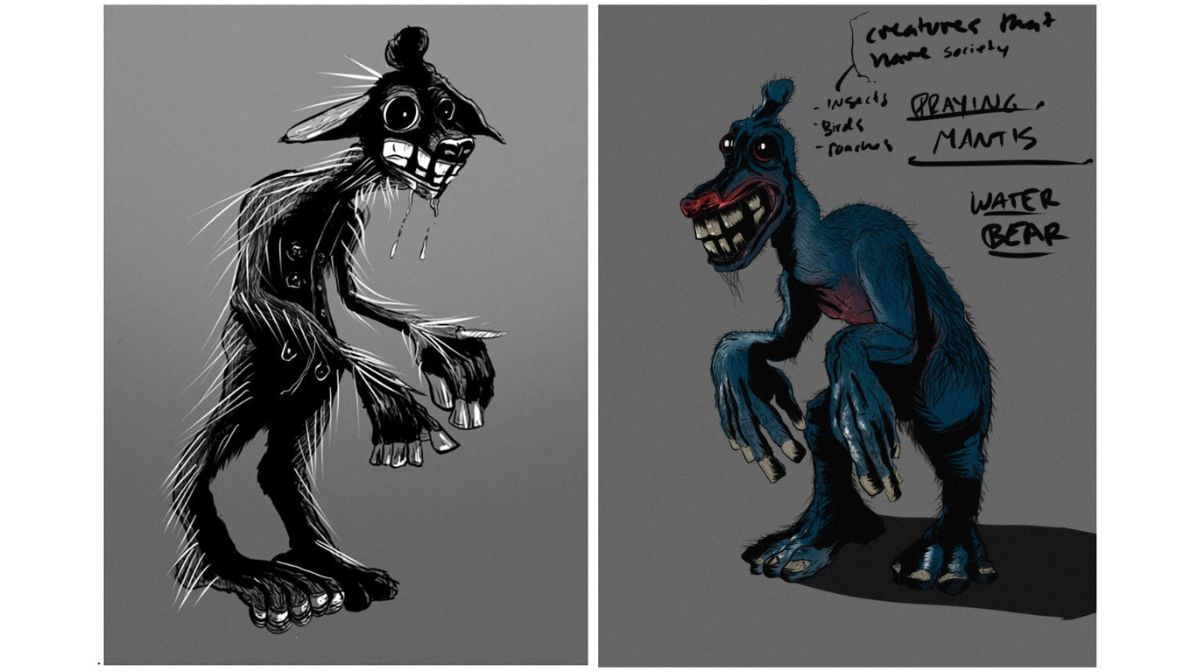 “Desde el principio tuve la idea de grandes ojos nocturnos y enormes dientes espaciados”, explica. “Dientes demasiado grandes para la boca de la criatura. Goofy, el personaje de Disney, fue una gran inspiración”.