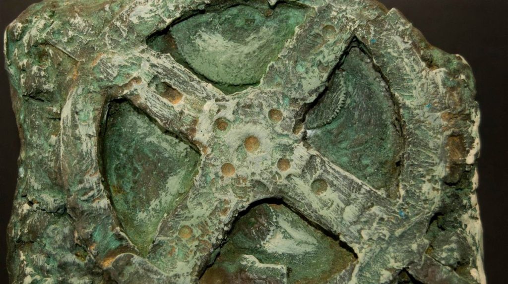 En realidad es una referencia al Mecanismo de Anticitera, una pieza compuesta de engranajes diferenciales que podría considerarse como una computadora analógica de la antigüedad. A través de este artefacto se podían calcular las posiciones del Sol, de la Luna, los eclipses, los ciclos de calendarios y la posición de los planetas.